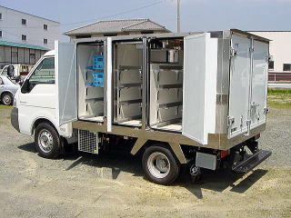 《病院食温冷蔵車仕様一覧》 <ボデ−材質> 内外板FRP製 断熱スチレンフォ−ム 扉門枠ステンレス製 <室内装備> アルミ製可変脱着棚 室内灯各1灯 <温度管理> 温蔵室 +65℃ ウォ−タ−ヒ−トポンプ方式 冷蔵室 + 5℃ 冷媒サイクル冷却方式 温度管理 運転席内デジタルコントロ−ラ−
