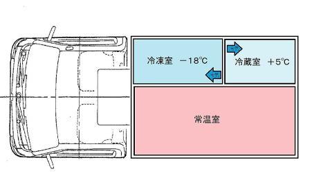 【冷凍・冷蔵・常温 3室式異温度配送車】 −18℃の冷凍品、+5℃の冷蔵品、 そして常温品の異温度帯商品を 適正な温度管理にて同時に配送出来ます。 温度管理は冷凍室・冷蔵室とも運転席の デジタルコントロ−ラ−で行ないますので 安心した品温管理が出来ます。 ※外気温の高い時期、また走行時間・ 開閉頻度により設定温度まで冷却 出来ない場合があります。 ※車種・車型によっては装着出来ない 場合があります。