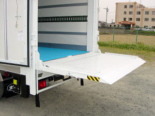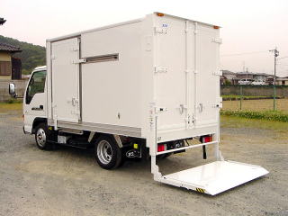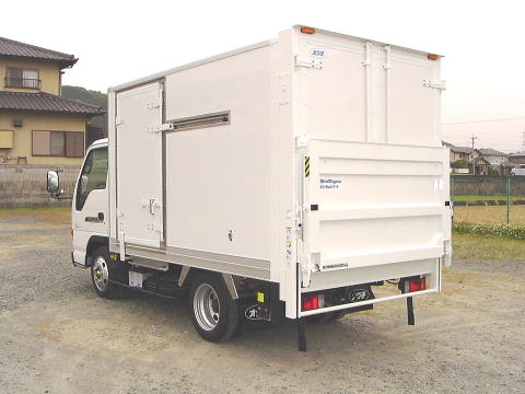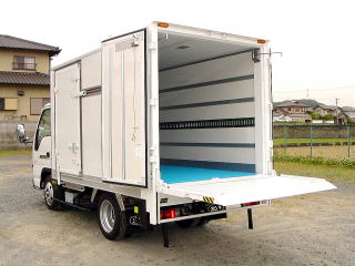《仕様例》 内外板FRP製断熱ウレタン75mm 扉、 左サイドスライド扉 リア観音扉 床面、 ステンレス平板張 (樹脂製スノコ敷き) 冷凍機、エンジン直結式低温冷凍機 装備、 垂直ゲ−ト付 (ア−ムゲ−トも装備出来ます) ラッシングレ−ル1段 90゜ドア開放ストッパ−付